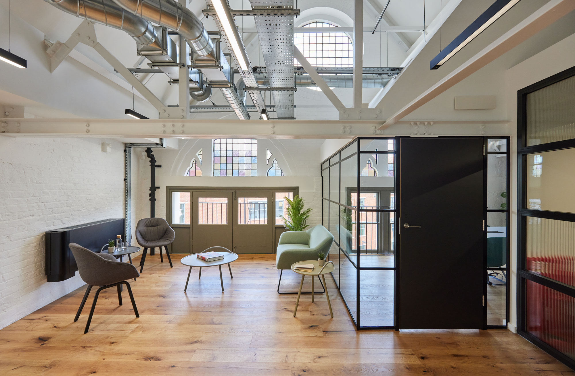The entrance focuses on welcoming visitors into the space, creating pockets of rest and socialisation for employees. Half-height, barn-style doors sit beneath ecclesiastical stained-glass windows, and open to emit fresh air and soft sounds of the busy streets below.