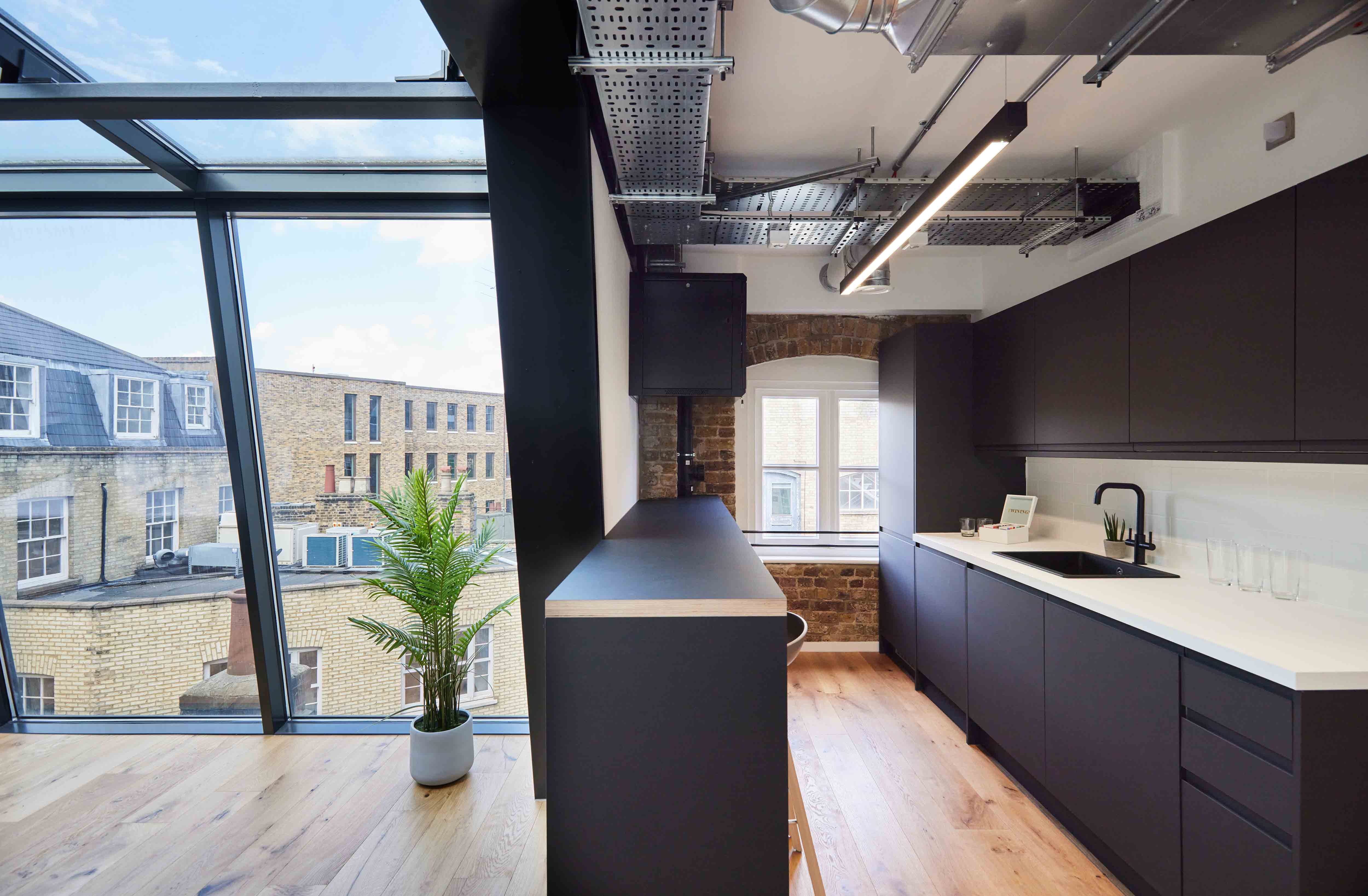 Situated just a short walk away from Farringdon station and nestled amongst cobbled streets lined with independent eateries, 18-20 St John Street is well catered for with local amenities. To maximise on space versatility, the tea point was therefore kept small and simple, and worked with the positioning of existing water pipes. The kitchen sits at the end of the floorplate, with everything coming before, from the social reception space to the desking flooded with natural light and sky views, leading the user on an intuitive journey throughout the space.