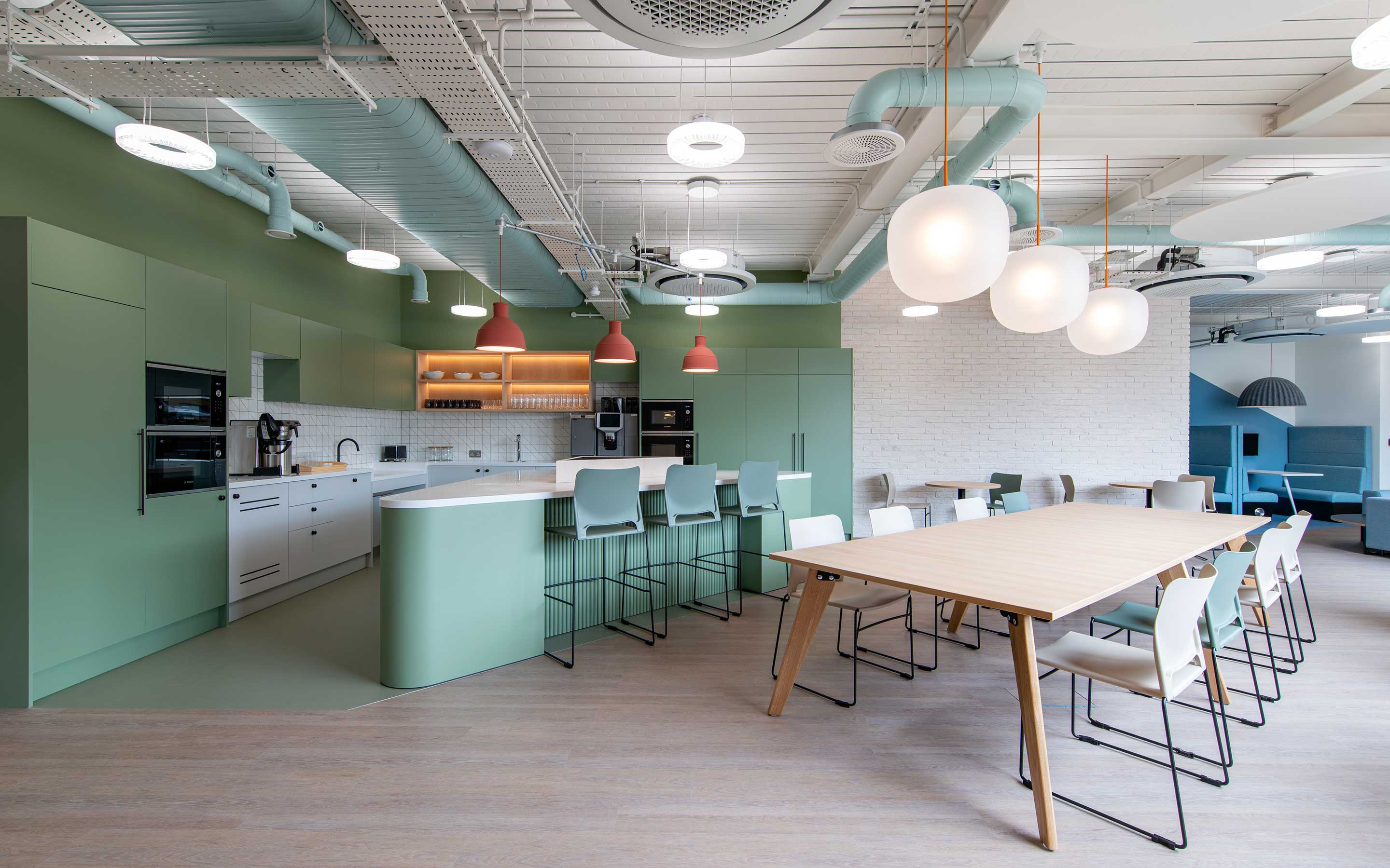 The fit out is rated SKA Gold, showcasing a sustainability-led design approach, starting with material procurement. Kitchen countertops are made from recycled yoghurt pots to give an impressive marble-like finish, and focus rooms features eco-friendly cork wall tiles with the dual effect of visual interest, and reducing noise travel.