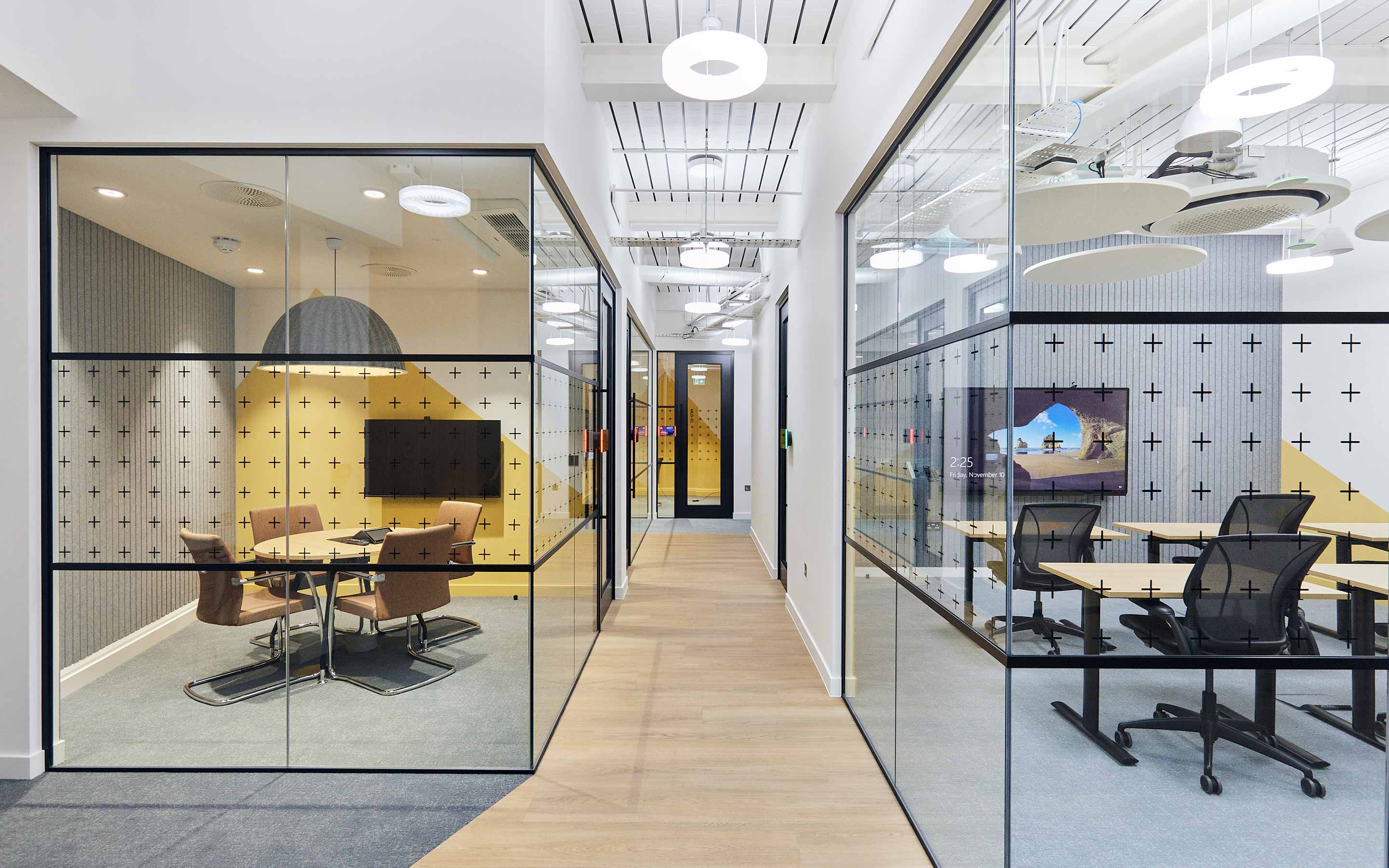 In fact, acoustics were carefully orchestrated throughout the entirety of the workplace. Peldon Rose’s Mechanical and Electrical team carried out a noise reverberation rating, considering speech privacy, performance, background noise, and masking, the art of minimising unwanted sound disturbance. The results informed the installation of acoustic panels which feature against the hard roofing and fan cool units to soften noise travel. Cross talk attenuators are also in place in air ducts, allowing airflow but limiting noise travel between rooms, crucial to preserve confidentiality.